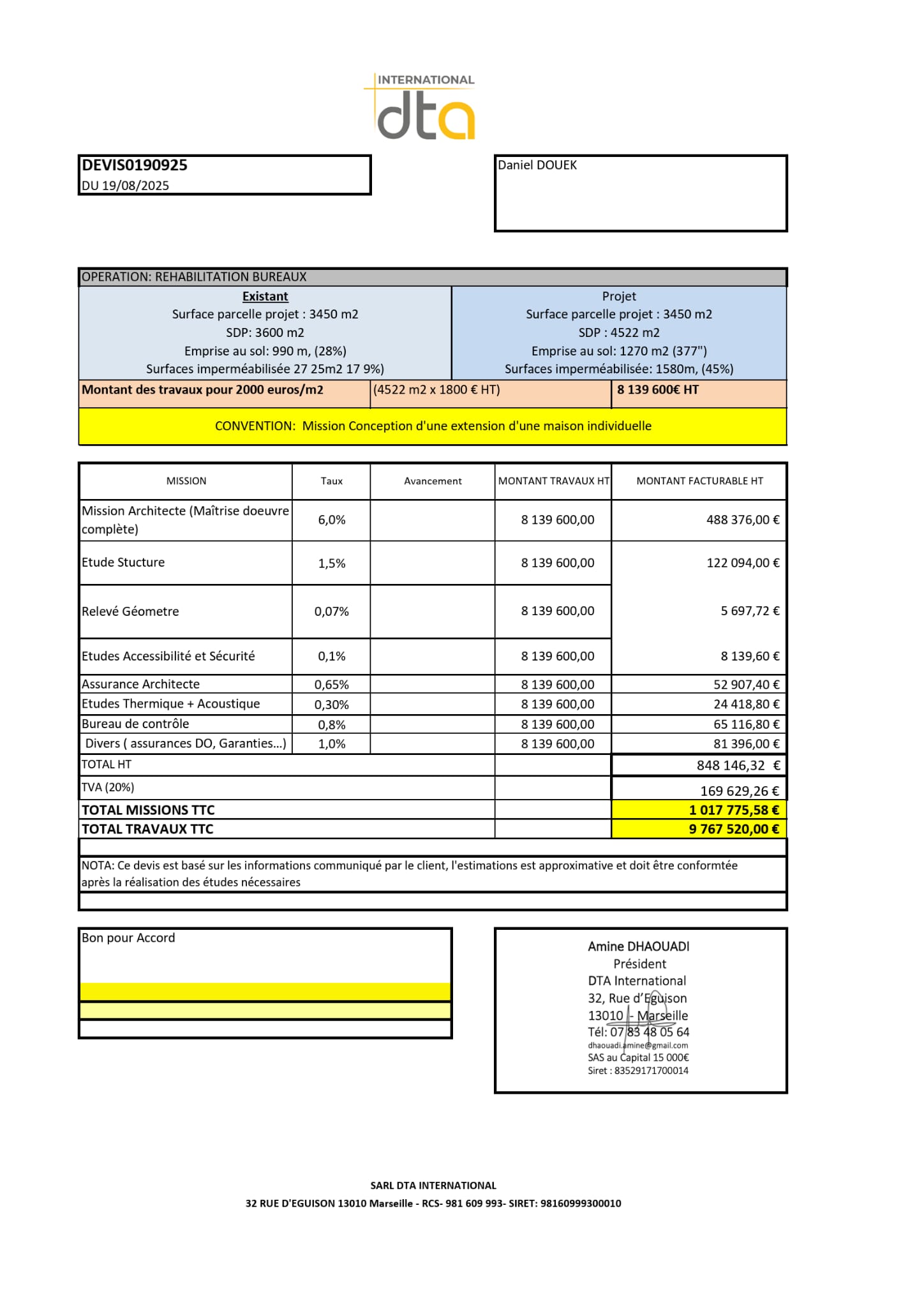 Devis detaille du cabinet DTA International pour la rehabilitation du batiment.